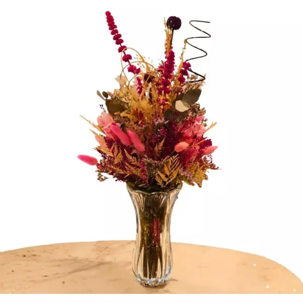 O Arranjo de Flores Secas Rosé Charmant traz uma composição rica em tons rosados, dourados e avermelhados, criando um visual sofisticado e acolhedor. Produzido em um vaso de vidro elegante, ele combina texturas naturais e elementos preservados que mantêm sua beleza por muito mais tempo.