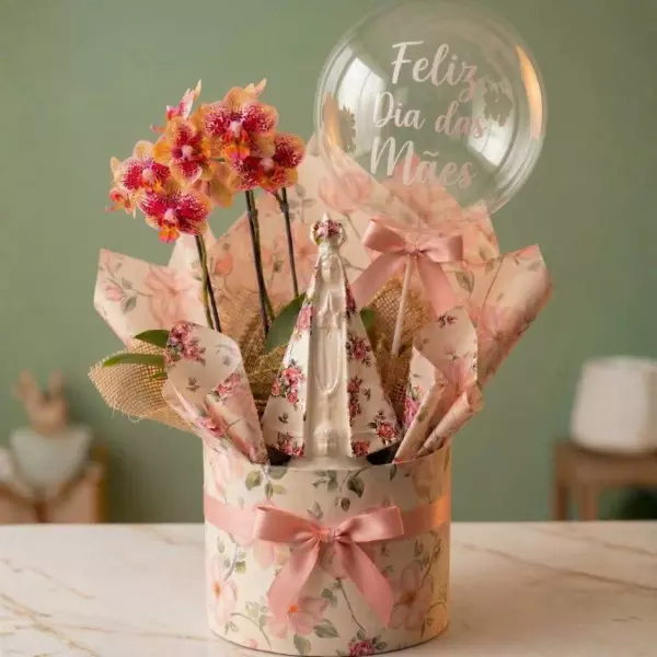 Para tornar o momento ainda mais especial, a box é finalizada com um balão personalizado ("Feliz Dia das Mães") e laços suntuosos de fita de cetim. É o símbolo de proteção ideal, unindo o sentimento espiritual à beleza das flores nobres.