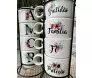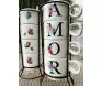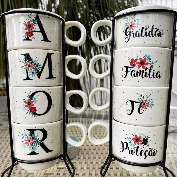 Conjuntinho de 4 canecas que juntas formam a palavra 'amor' - em seus versos existem outras palavras com significados bem fortes como 'gratidão', 'família', 'fé', e 'proteção'.