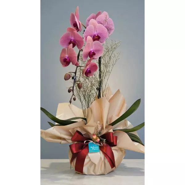 A apresentação é o ponto alto deste produto: a orquídea é envolta em uma embalagem premium na cor champagne, que evoca elegância e modernidade. O acabamento é feito com um suntuoso laço avermelhado, criando um contraste rico que valoriza as cores naturais da planta. Ideal para aniversários, celebrações de conquistas ou para decorar ambientes com um toque de classe.